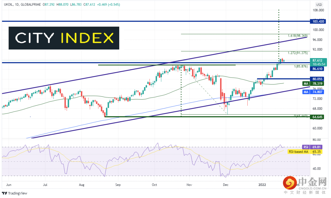 西得州原油差价合约和布伦特原油差价合约站上2021年10月高点,创下2014年10月以来最高点,前者盘中高点达到87.90,后者则为88.64。在美国通胀率高达7%、英国通胀率触及5.4%的背景下,油价逼近新的短线高点也在情理当中。另外,OPEC宣布,预计今年原油市场需求旺盛,主要原因是各经济体在疫情后陆续重启经济活动。供应端看,部分OPEC+成员国未能用尽产出配额。再加上波斯湾和俄罗斯地缘政治动荡,这些因素悉数助涨油价。