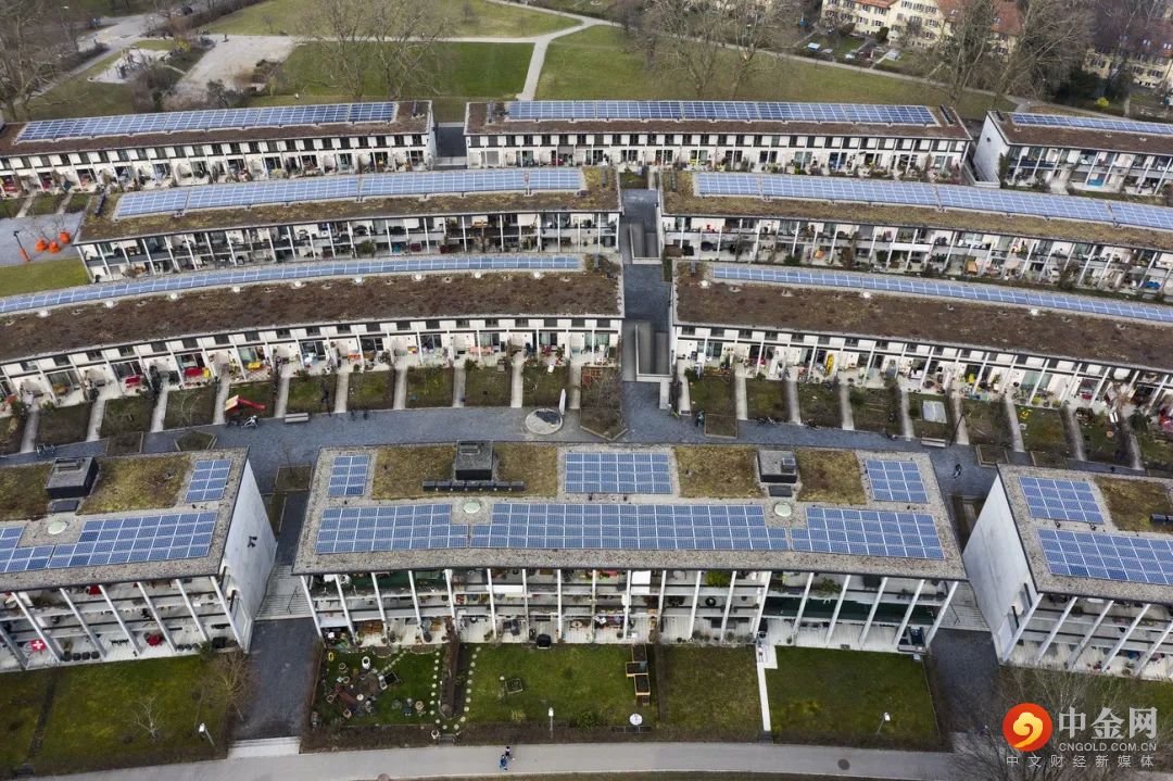苏黎世格林马特(Grünmatt)住房合作社里房屋屋顶上的太阳能电池板,2021年3月。