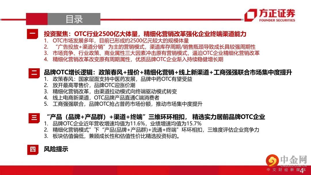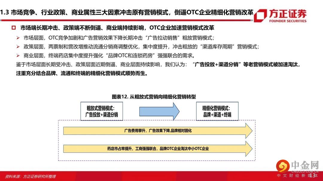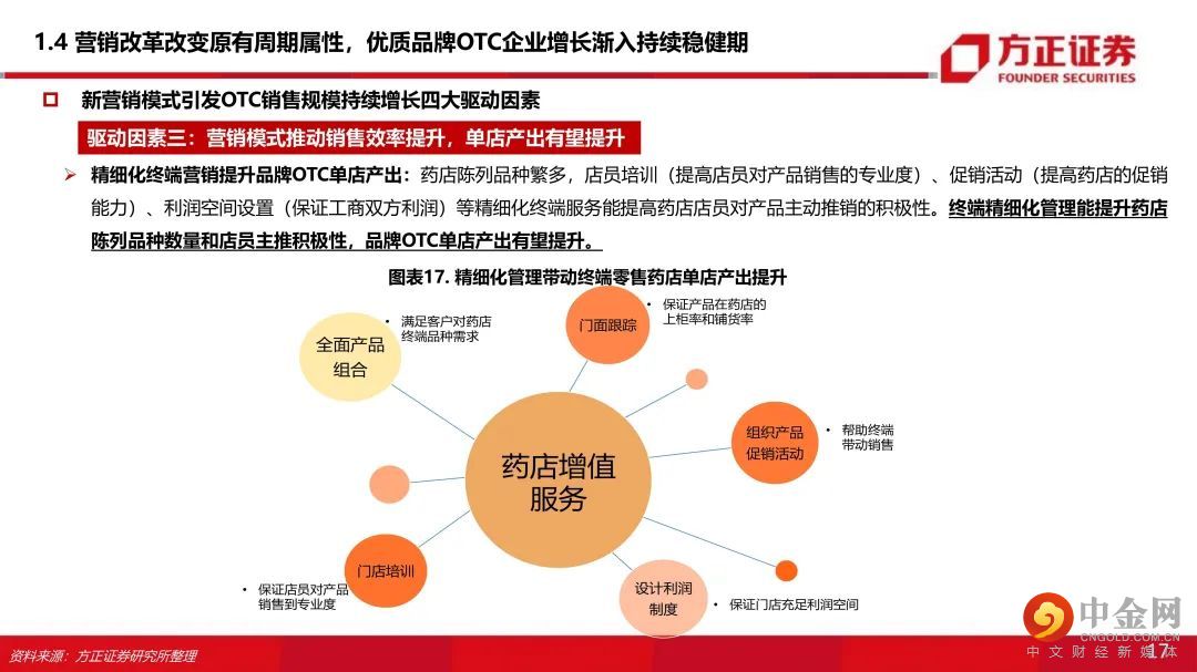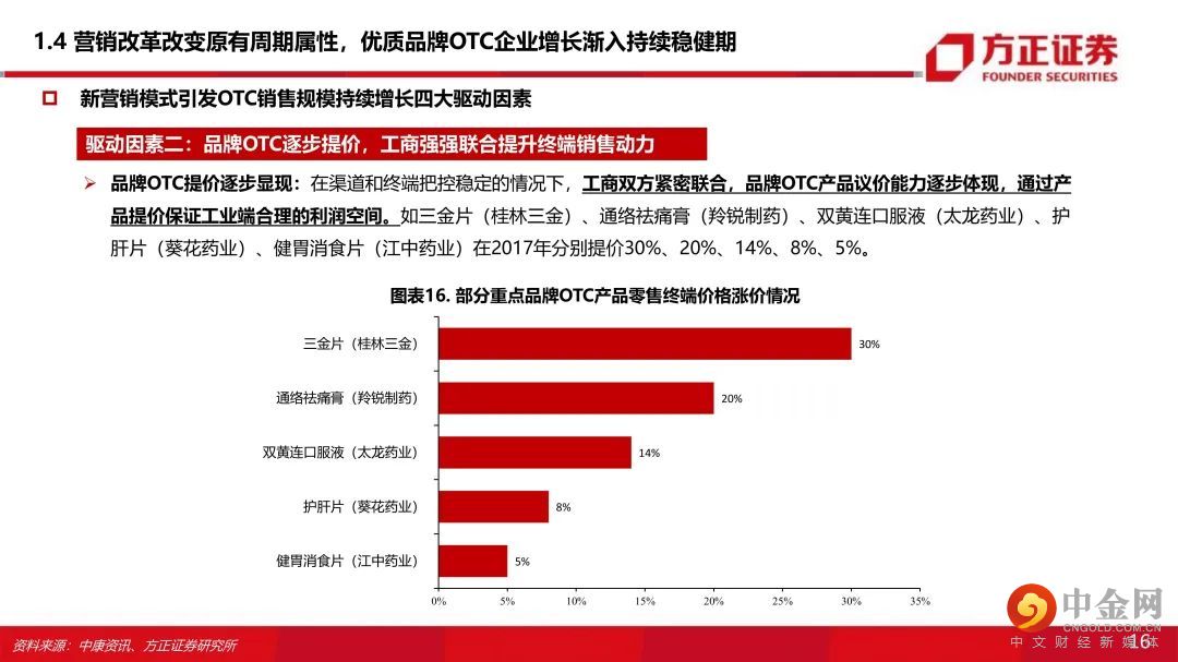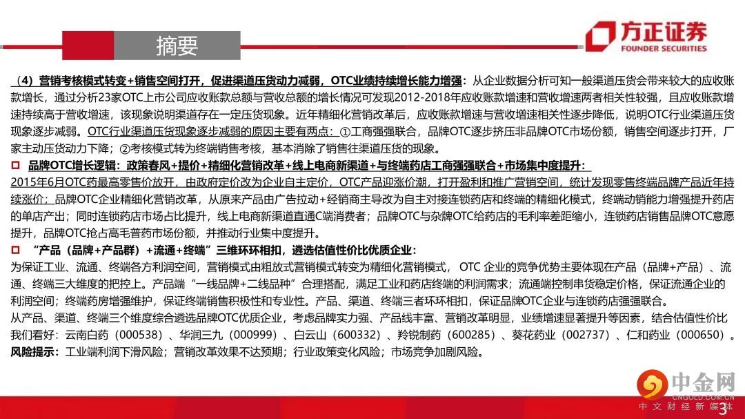 一、“市场竞争+行业政策+商业属性”多维冲击下,品牌OTC厂家营销改革为精细化模式 :原有的“广告投放+渠道分销”为主的营销模式叠加渠道库存周期和销售瓶颈使得品牌OTC企业成长具有显著周期性。受市场竞争、行业政策、商业属性等多维度冲击,品牌OTC企业营销普遍转型为精细化模式。二、四大驱动因素引发优质品牌OTC的业绩从周期性减弱,业绩渐入持续性稳健增长:OTC企业过去出现业绩周期性波动的核心原因在于销售目标与营销效率不匹配,“库存周期+销售空间瓶颈”导致OTC企业业绩周期性波动。近年营销改革后,基于以下原因,我们认为优质OTC企业业绩增长逐步摆脱原有的周期性,进入持续增长阶段:(1)零售药店连锁率提升,提升品牌OTC市场份额:在新的精细化营销模式下,品牌OTC厂家与大型连锁药店强强联合的商业属性决定了品牌OTC覆盖终端销售将伴随着药店行业集中度提升而提升(工商强强联合优势品种提升市场份额);(2)工商强强联合,品牌OTC提价能力显现:在渠道和终端把控稳定的情况下,品牌OTC产品议价能力逐步体现,品牌OTC通过产品提价保证工业端合理的利润空间;(3)精细化终端营销提升品牌OTC单店产出:店员培训、促销活动、关系维护等精细化终端服务能提升药店陈列品种和主推积极性,产品单店产出有望提升。(4)营销考核模式转变+销售空间打开,促进渠道压货动力减弱,OTC业绩持续增长能力增强。①工商强强联合,品牌OTC逐步挤压非品牌OTC市场份额,销售空间逐步打开,厂家主动压货动力下降;②考核模式转为终端销售考核,基本消除了销售往渠道压货的现象。三、品牌OTC成长逻辑:政策春风+提价+精细化营销改革+与药店终端工商强强联合+线上电商新渠道+品牌产品市场集中度提升。四、“产品(品牌+产品群)+流通+终端”三维环环相扣,遴选估值性价比优质企业:考虑品牌实力强、产品线丰富、营销改革明显,业绩增速显著提升等因素,结合估值性价比我们看好:云南白药(000538)、华润三九(000999)、白云山(600332)、羚锐制药(600285)、葵花药业(002737)、仁和药业(000650)。风险提示:工业端利润下滑风险;营销改革效果不达预期;行业政策变化风险;市场竞争加剧风险。