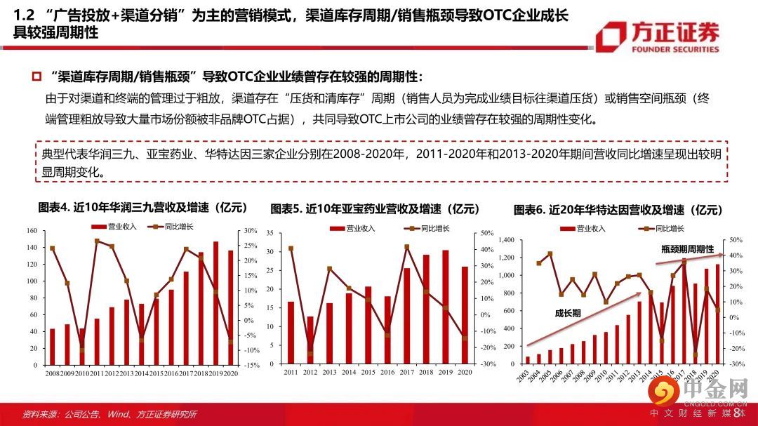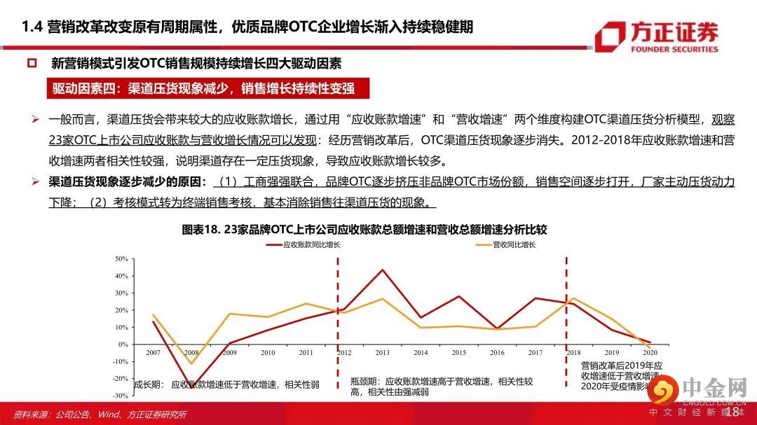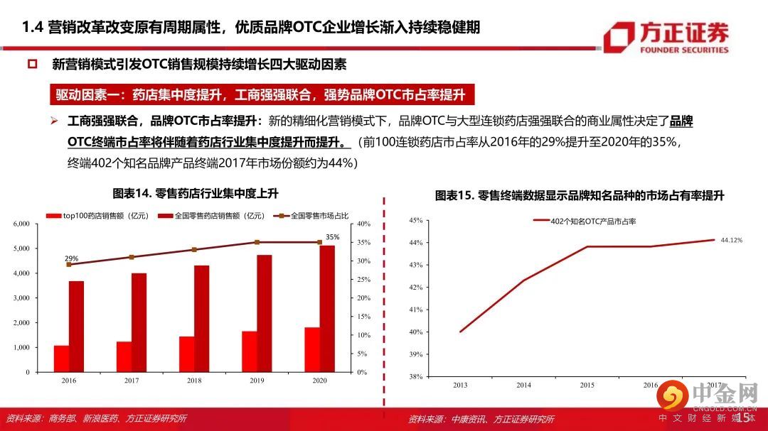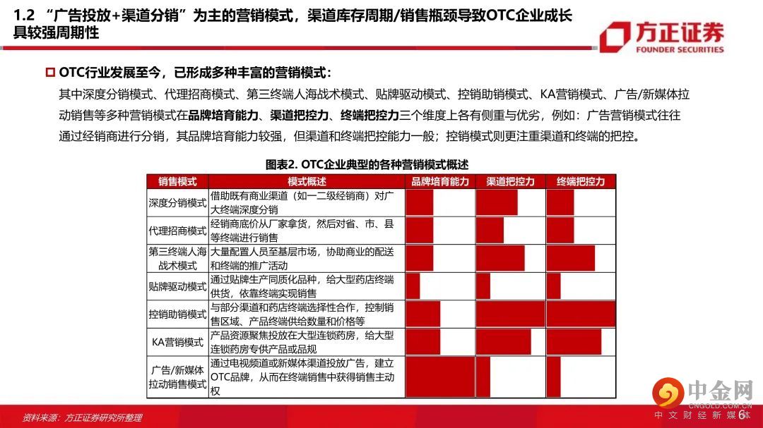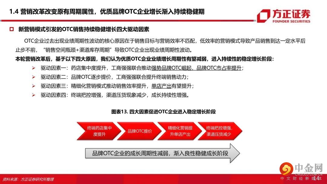一、“市场竞争+行业政策+商业属性”多维冲击下,品牌OTC厂家营销改革为精细化模式 :原有的“广告投放+渠道分销”为主的营销模式叠加渠道库存周期和销售瓶颈使得品牌OTC企业成长具有显著周期性。受市场竞争、行业政策、商业属性等多维度冲击,品牌OTC企业营销普遍转型为精细化模式。二、四大驱动因素引发优质品牌OTC的业绩从周期性减弱,业绩渐入持续性稳健增长:OTC企业过去出现业绩周期性波动的核心原因在于销售目标与营销效率不匹配,“库存周期+销售空间瓶颈”导致OTC企业业绩周期性波动。近年营销改革后,基于以下原因,我们认为优质OTC企业业绩增长逐步摆脱原有的周期性,进入持续增长阶段:(1)零售药店连锁率提升,提升品牌OTC市场份额:在新的精细化营销模式下,品牌OTC厂家与大型连锁药店强强联合的商业属性决定了品牌OTC覆盖终端销售将伴随着药店行业集中度提升而提升(工商强强联合优势品种提升市场份额);(2)工商强强联合,品牌OTC提价能力显现:在渠道和终端把控稳定的情况下,品牌OTC产品议价能力逐步体现,品牌OTC通过产品提价保证工业端合理的利润空间;(3)精细化终端营销提升品牌OTC单店产出:店员培训、促销活动、关系维护等精细化终端服务能提升药店陈列品种和主推积极性,产品单店产出有望提升。(4)营销考核模式转变+销售空间打开,促进渠道压货动力减弱,OTC业绩持续增长能力增强。①工商强强联合,品牌OTC逐步挤压非品牌OTC市场份额,销售空间逐步打开,厂家主动压货动力下降;②考核模式转为终端销售考核,基本消除了销售往渠道压货的现象。三、品牌OTC成长逻辑:政策春风+提价+精细化营销改革+与药店终端工商强强联合+线上电商新渠道+品牌产品市场集中度提升。四、“产品(品牌+产品群)+流通+终端”三维环环相扣,遴选估值性价比优质企业:考虑品牌实力强、产品线丰富、营销改革明显,业绩增速显著提升等因素,结合估值性价比我们看好:云南白药(000538)、华润三九(000999)、白云山(600332)、羚锐制药(600285)、葵花药业(002737)、仁和药业(000650)。风险提示:工业端利润下滑风险;营销改革效果不达预期;行业政策变化风险;市场竞争加剧风险。