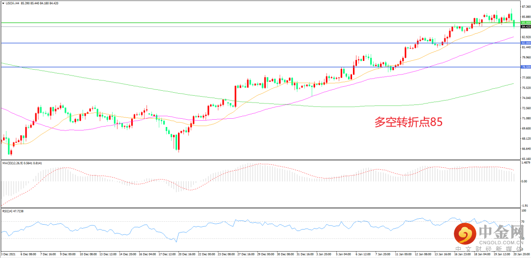 4小时图看,油价连续上行后小幅回落,但上行趋势依然未受到破坏,55周期均线成为下方支撑,85美元成为多空分水岭,MACD红柱缩短,RSI指标走平,日内延续震荡概率较大。