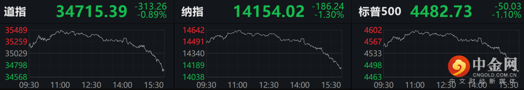 最终,三大指数连续第三日集体收跌。领跌的纳指收跌1.3%,报14154.02点,创去年6月21日以来新低;标普收跌1.1%,创去年10月15日以来新低;道指连跌五日,收跌313.26点,跌幅0.89%,报34715.39点,创去年12月3日以来新低,盘中振幅超800点。