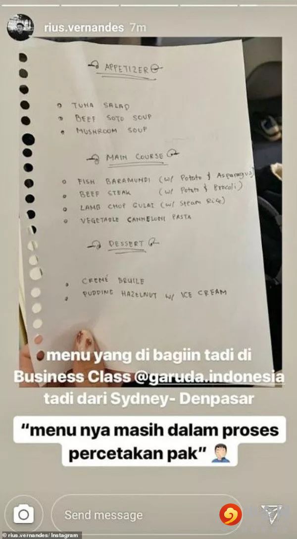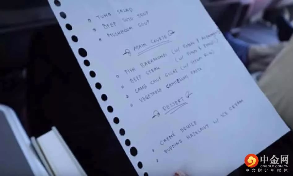 事发当天,他和女友乘坐的是一架悉尼起飞的印尼Garuda航空公司的头等舱,在用餐时候,空姐把一张手写的菜单给他看,让他进行点餐。