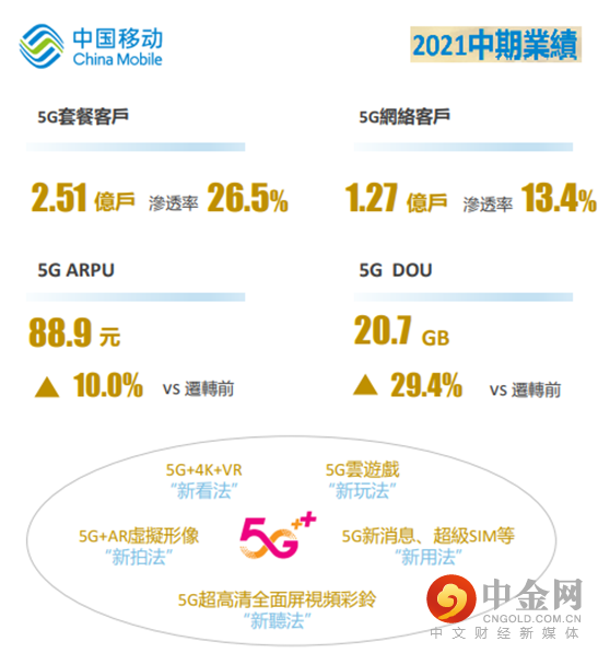 1. 母公司拟于2022年内,在二级市场回购CNY 30-50亿A股 2. 上述回购量,虽仅占总发行股数的小部份,但若回购行动,支撑及后A股股价气氛,而在「AH股折让,或不能扩大至不合理水平」的情况下,这A股回购操作,亦可望对H股股价带来支持 3. 中移动H 股,2022年至今已连续多日,居于南向北水净流入头三甲之例 (二). 基本面 1.2022年ARPU表现可望改善,料受惠旗下5G业务渗透率提升等带动,而ARPU改善料提振盈利、派息前景。2021年上半年,中移动5G ARPU 升10%、5G套餐客户渗透率达26% 2.每股股息的2020-23年预测年度复合增长(CAGR),料逾7%,而这相当于近8%的2022年预测股息率 图一:2021年上半年,中移动5G ARPU升10%、渗透率达26%