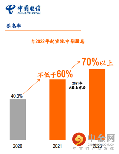 1. 2022年预期EV / EBITDA 率约2倍,相对国际同业的逾7倍估值,有明显折让,现时(i)「国进民退下,国企强势」主题、(ii)增派股息憧憬等,为中国电讯板块,带来估值重估机遇,而作为中国三大电讯商之一的中电信,其估值亦可望从而获得提振 (二). 基本面 1.2022年起宣派中期股息,料这将反映每股股息在2020-24年,有逾20%的预测年度复合增长(CAGR) ,而这亦相当于达8%的2022年预测股息率 图三:中电信增加派息