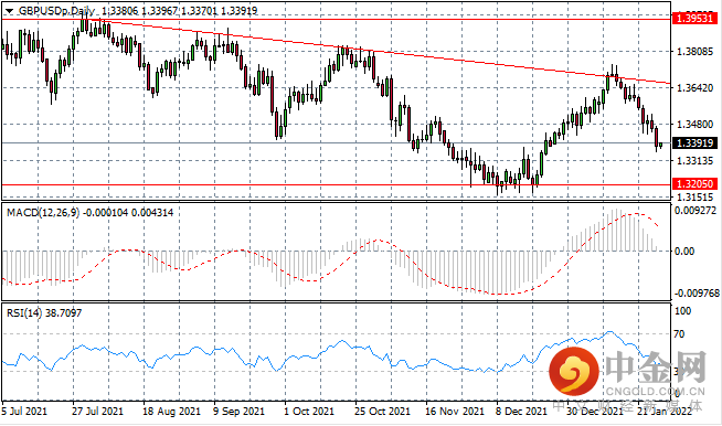 GBPUSD已成为抛售的主导,尽管买方出现一些阻拦,但走势是明确的。下一个测试将是 1.320 支撑位,该支撑位代表当前交易区间的下限,也是先前反弹形成的位置。动量指标呈下行轨迹,相对强弱指数(RSI)接近 30 线。