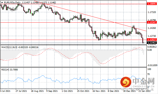 EURUSD卖盘活动急剧上升,此前的支撑位被突破。由于该货币对延续已经确立的长期看跌趋势,价格走势已跌破 1.120 支撑位。动量指标看跌,相对强弱指数(RSI)测试超卖线。