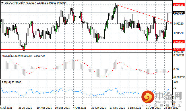 USDCHF继续冲向 0.936 上限,因为长烛反映出该货币对强劲的看涨支撑。卖方似乎保持活跃,并在价格走势中提供一些减速,如上影线所示。动量指标看涨,有一些边际上行潜力。