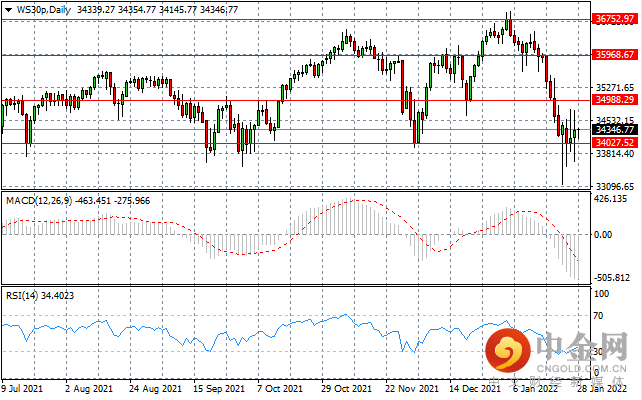WS30 在 2021 年 12 月开始的抛售后开始看涨复甦。长长的阴影代表买卖双方之间的争斗,但价格走势的轨迹证实看涨偏见。下一个测试是 34,988 价格线。动量指标正在经历看涨逆转。