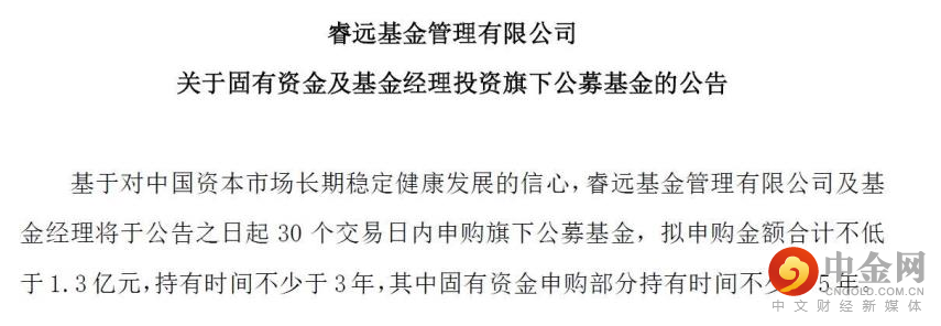 睿远基金1月27日发布公告称,基于对中国资本市场长期稳定健康发展的信心,公司及基金经理将于公告之日30个交易日内申购旗下公募基金,拟申购金额合计不低于1.3亿元,持有时间不少于2年,其中固有资金申购部分持有时间不少于5年。