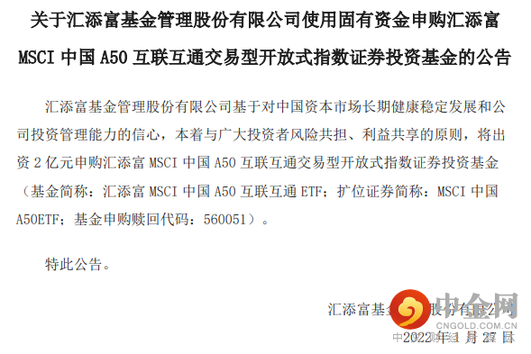 汇添富基金1月27发布公告称,基于对中国资本市场长期健康稳定发展和公司投资管理能力的信心,本着与广大投资者风险共担、利益共享的原则,公司将出资2亿元申购汇添富MSCI中国A50互联互通ETF。