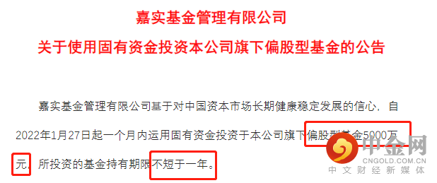 嘉实基金也发布公告称,公司基于对中国资本市场长期健康稳定发展的信心,自2022年1月27日起一个月内,运用固有资金投资本公司旗下偏股型基金5000万元,所投资的基金持有期限不短于一年。
