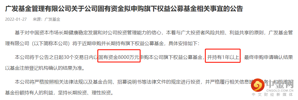 广发基金今日发布公告称,基于对中国资本市场长期健康稳定发展的信心和对公司投资管理能力的信心,公司将自1月27日起30个交易日内,以固有资金8000万元申购公司旗下权益公募基金,并持有1年以上。
