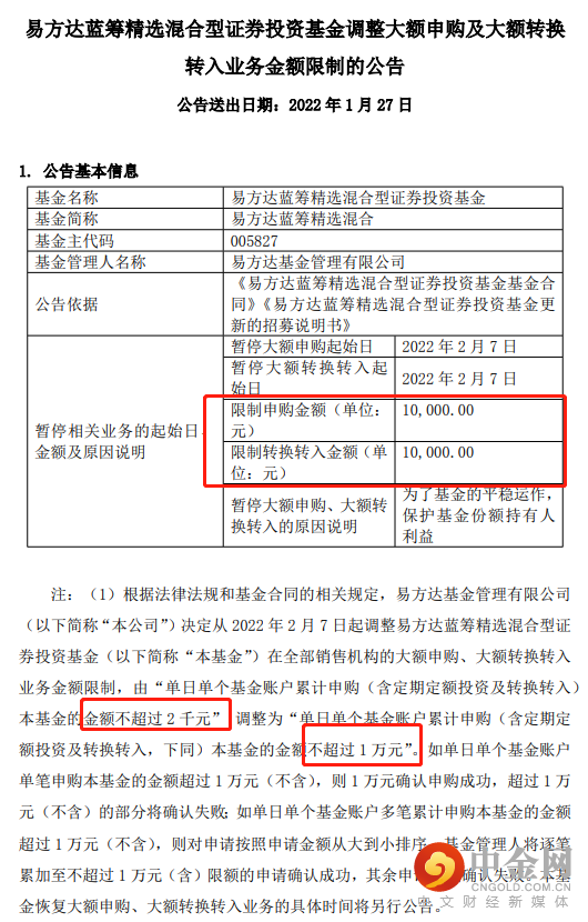 1月27日,易方达基金发布公告称,顶流张坤管理的易方达蓝筹精选自2022年2月7日起,该基金限制申购及定期定额金额由2000元调高至1万元。