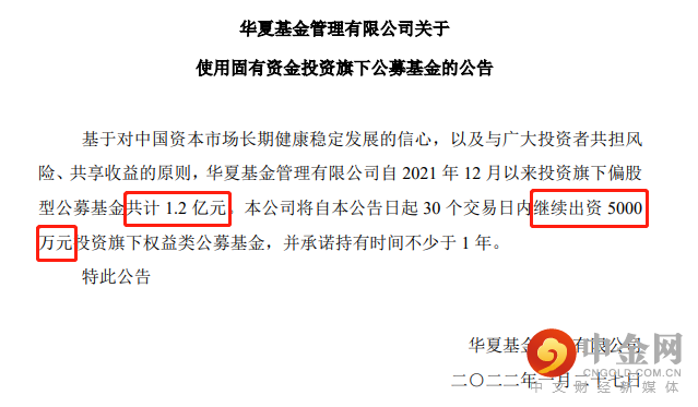 华夏基金发布公告显示,自2021年12月以来投资旗下偏股型公募基金共计1.2亿元,公司将自公告日起30个交易日内继续出资5000万元投资旗下权益类公募基金,并承诺持有时间不少于1年。