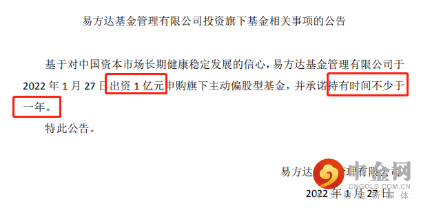 易方达基金当日发布的公告显示,基于对中国资本市场长期健康稳定发展的信心,易方达基金管理有限公司于 2022 年 1 月 27 日出资 1 亿元申购旗下主动偏股型基金,并承诺持有时间不少于一年。