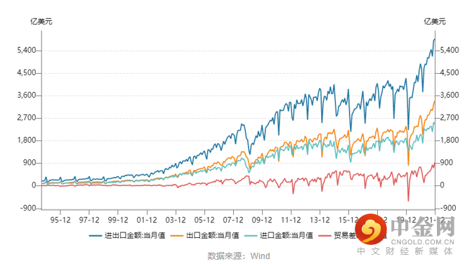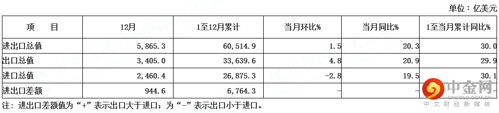 据海关总署统计,以美元计价,12月进出口总值达5865.34亿美元。其中,出口总值3404.99亿美元,同比20.9%,前值为22%;进口总值2460.35亿美元,同比19.5%,前值为31.7%;顺差规模有所扩大。