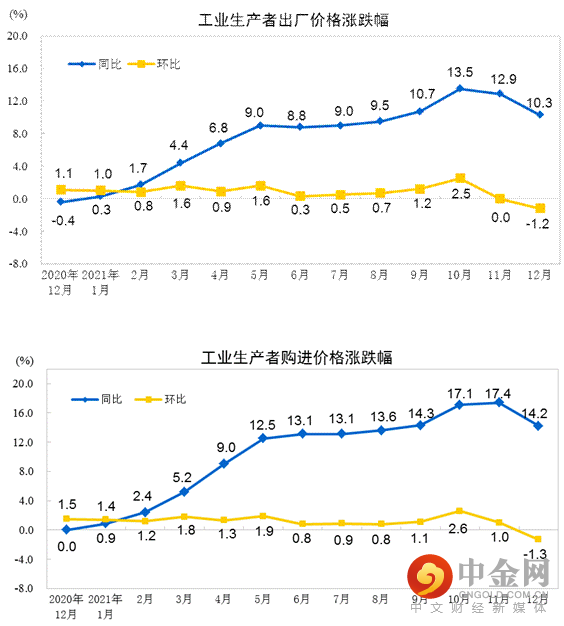 2021年12月份,全国工业生产者出厂价格同比上涨10.3%,环比下降1.2%;工业生产者购进价格同比上涨14.2%,环比下降1.3%。2021年全年,工业生产者出厂价格比上年上涨8.1%,工业生产者购进价格上涨11.0%。