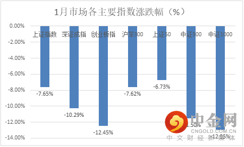 1月市场大小指数齐跌,各主要指数均录得不同程度的跌幅,其中沪指失守3400点,创业板月跌幅超过12%。