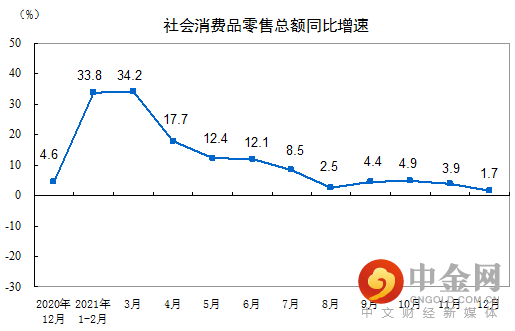 2021年,社会消费品零售总额440823亿元,比上年增长12.5%,两年平均增速为3.9%。2021年12月份,社会消费品零售总额41269亿元,同比增长1.7%。