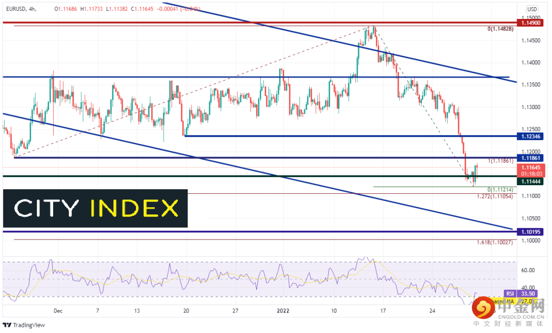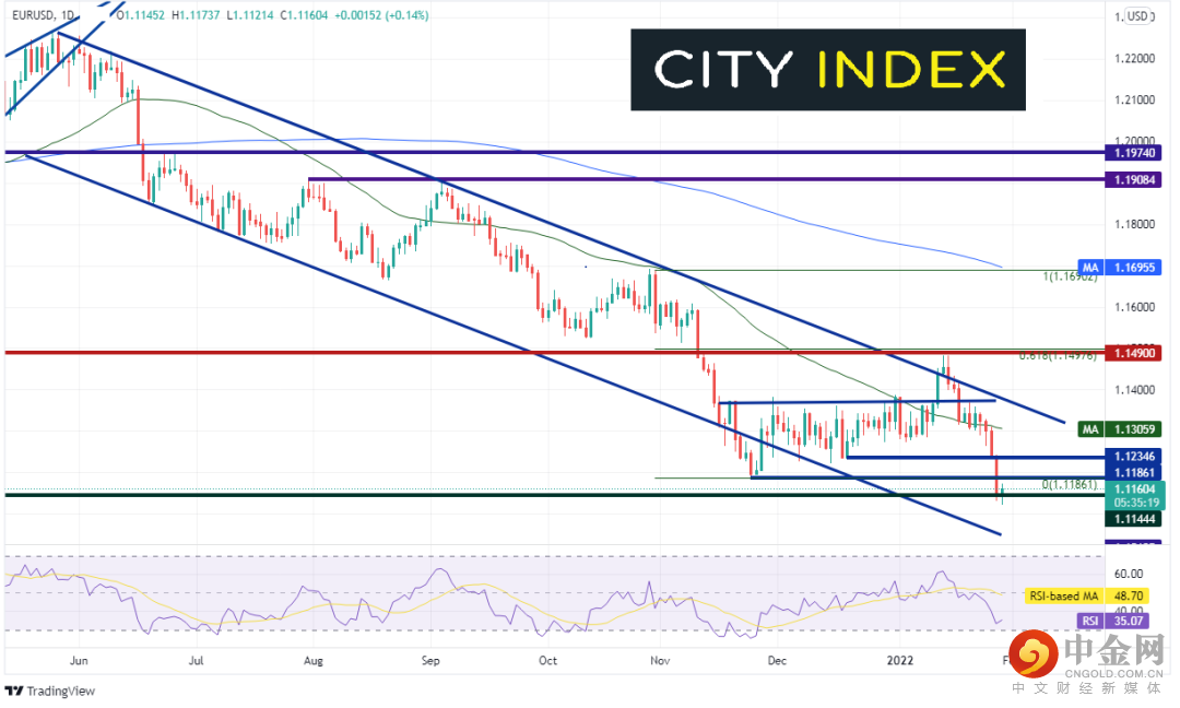 2021年5月以来,欧元/美元一直有序下跌,形成下降通道。继2021年11月24日假性下破通道至1.1186之后,该货币对又回到前述通道内。欧元/美元窄幅交投,直至1月12日假性上破该通道上轨,至1.1490附近。该货币对随后回到通道内且加速下滑,攻克11月以来低点1.1186,近期考验2020年3月以来支撑位1.1144附近。