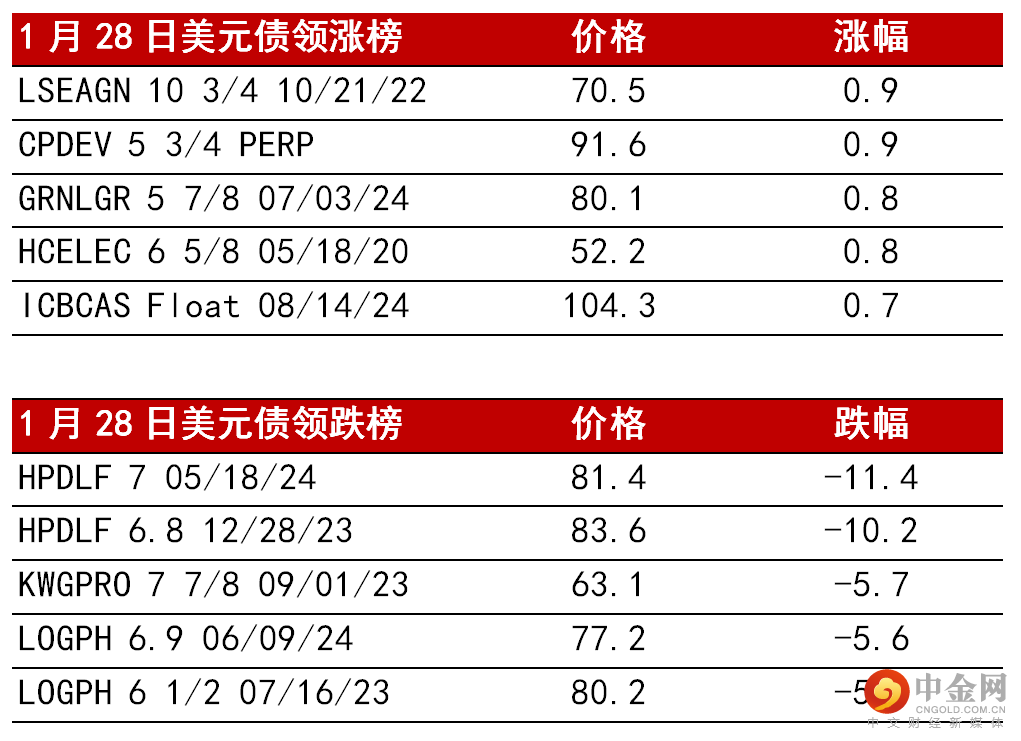 上周五(1月28日),高收益地产板块整体表现相对疲软。合生创展债券在PwC辞任审计师后整体下跌12-15pts,但在媒体报道公司拟聘请EY为新任审计师后小幅回升3-4pts。碧桂园/融创/龙光等地产债券受市场卖盘影响,全日下跌3-5pts。高评级债券如旭辉出现市场交投较少,收盘小幅走低1-2pts。工业板块债券如复星整体价格维持不变。