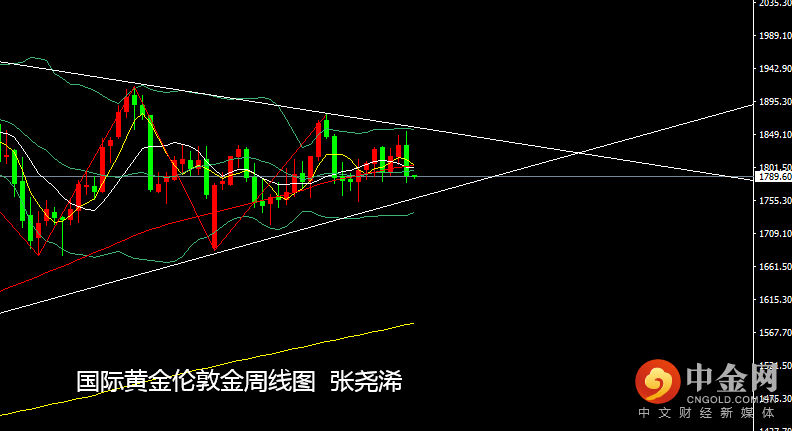 黄金市场上周,国际黄金伦敦金大幅回落收跌。仍继续保持着近一年多左右的三角趋势形态运行。
