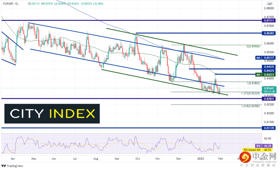 2021年4月底以来,欧元/英镑一直交投于一个下降通道内,但自2021年8月开始拓宽通道,沿着大致落在0.8320 - 0.8350的通道下轨趋势线交投。上周,欧元/英镑回到50天均线但“攻城”失败,回落至通道的下轨趋势线。该货币对今天再度试图反击,目前交投于0.8350附近的阻力位。