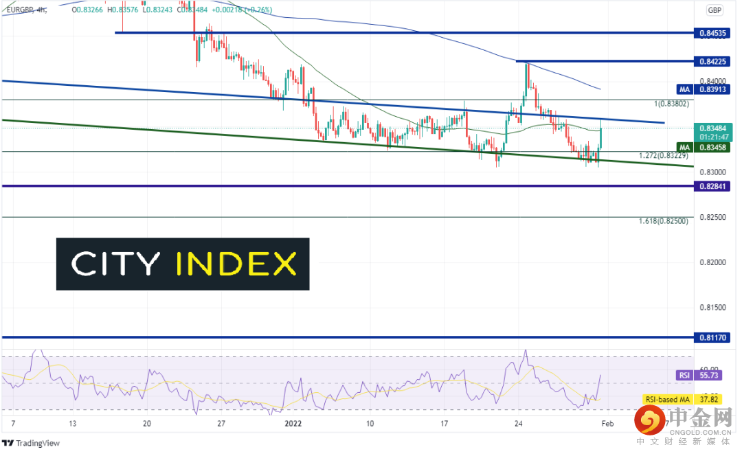 欧元/英镑4小时图第一阻力位在前低点0.8320,然后是0.8222附近,由1月24日高点和50天均线相汇而成。接着是0.8453的水平阻力位。支撑位在趋势线低点0.8305附近,然后是2020年2月以来的水平支撑位0.8282,接着是2021年11月19日低点到12月8日高点行情的161.8%扩展位,即0.8250附近。如果失守,欧元/英镑可能跌至0.8117附近的水平支撑位,那是2016年4月以来的上影线高点。