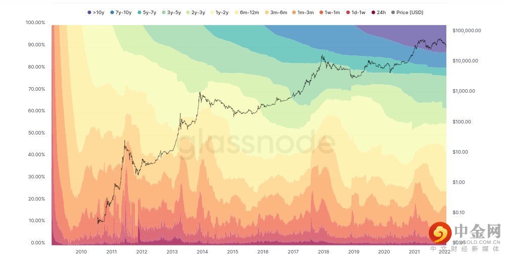 BTC 长期持有者在抛售期间也保持忠诚:一年或更长时间保持稳定的 BTC 供应比例已达到先前投降事件中未见的水平。如下图所示,休眠至少一年的代币现在占 BTC 总供应量的 60%。
