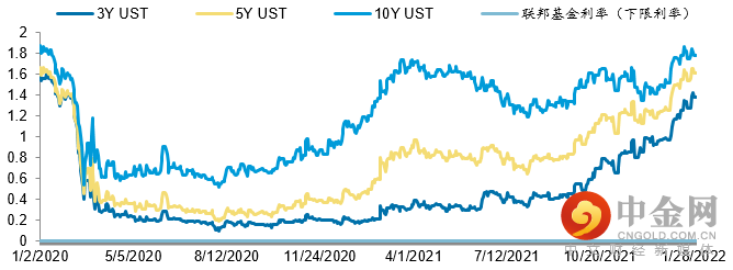 上周美联储议息会议后发表声明称将在3月初结束资产购买,并且将适时提高联邦基金利率,并在加息后开始缩减资产负债表。美国公布去年第四季度GDP增长率6.9%,超过预期,更加坚定了鲍威尔的鹰派决心,鲍威尔表示,将在3月的议息会议上加息,且不排除之后的每次会议上都加息的可能性。