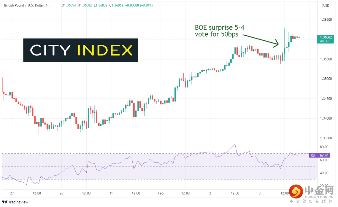 英国央行宣布加息25个基点,这样的决策符合预期。但9名成员中有4名成员投票支持加息50个基点,所以加息幅度差点就达到50个基点。这点出乎市场意料,英镑因此全线飚升。关于这次票数非常接近的投票,央行行长Baily表示,成员们就应该渐进式收紧银根还是现在就大举行动释放信号展开了激辩。