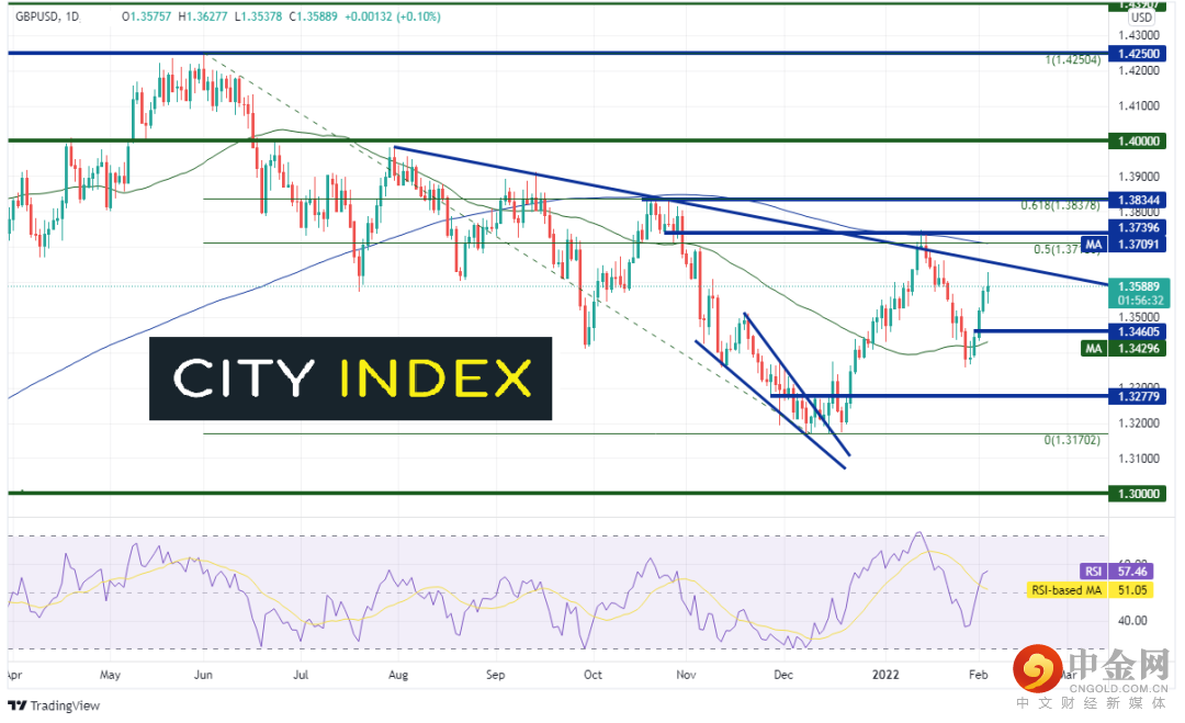 英镑/美元自2021年6月1日在1.4250附近构筑短线顶部以来高点不断下降,于12月8日在一个下降楔形形态内,即1.3170附近筑底。该货币对随后向上打破此形态并在1月13日进入由多个阻力组成的1.3710 - 1.3740区间,包括下降趋势线、200天均线、水平阻力位和2021年6月1日高点到12月8日低点行情的50%回档位。自那以后,英镑/美元一直交投于50天均线和200天均线组成的区间内,两者分别落在1.3430 和 1.3709。