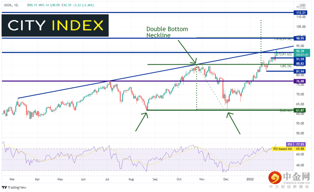 西得州原油轻松上涨,本周再斩获近6.0%的涨幅。疫情爆发以来,该黑金大宗商品就不断走高,最高创下2014年9月以来最高点,而且一路走来形成了双底形态。2021年12月2日,油价在61.87附近形成双底形态第二个“底”。周五,油价达到93.14高点。双底形态的目标是颈线突破位加上双底低点到颈线的高度。本例中在108.30附近。油价会到达该目标吗?