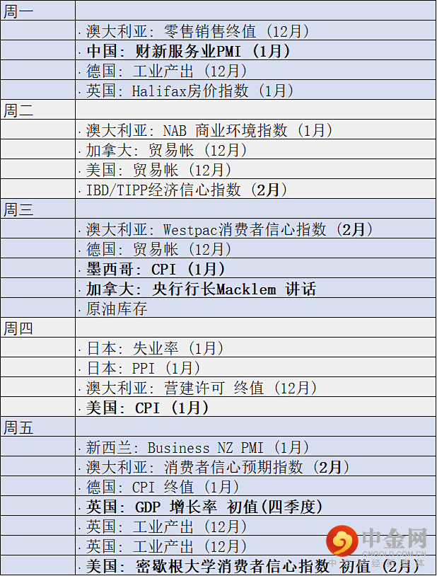 美国周五公布的非农就业报告表现强劲。平均每小时收入同样强劲,报在0.7%。请注意,美联储期待薪资与通胀同步上涨,但又不希望收入增长“过快”。一个月的第二周数据通常不多,本周也不例外。本周的核心数据是定于周四揭晓的美国CPI。美联储主席鲍威尔曾表示,美联储下一步决策将视数据而定。如果CPI强于预期的7.3%,美联储或有理由在3月加息50个基点。另请关注将在周五披露的密歇根大学消费者信心指数的物价支付分项指标。本周其它重要数据如下: