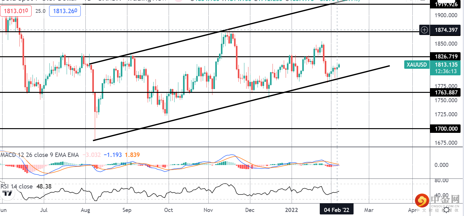 黄金价格再次从牛市通道低点的最新测试中走高。 随着 MACD 和 RSI 开始走高,重点是进一步上行。 然而,多头需要看到价格迅速回到 1826.71 水平上方,这仍然是需要注意的关键近期阻力。 在此上方,接下来焦点将转向 1871.04。 不利的一面是,任何下跌都将看到 1763.88 成为第一支撑。