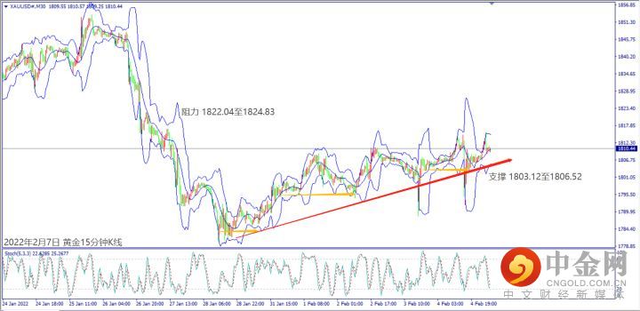 日级别线图,连续上涨再创七年新高,移动均线多方排列,有望延续涨势;15分钟K线,短线形成盘涨,守稳上升趋势线,大有可能挑战前高阻力。