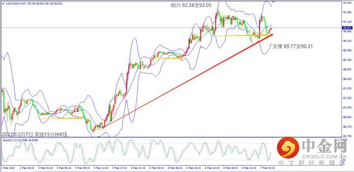 上周地缘政治和美国气候不佳,造成美油价格大涨突破90关口。如果今天欧美公布新冠确诊人数持续下降,美油价格守住小时布林带下轨线89.50美元,建议可短多操作。