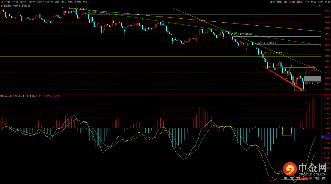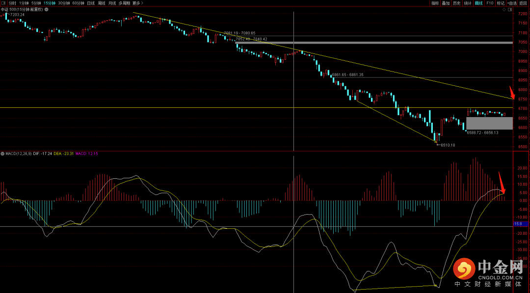 中证500短期已经走完了十五分钟的底背弛反弹结构,短期即将来到下降趋势线附近,这个位置大概率会有一定的压制,在无法放量突破的状态下大概率会出现再次的回落走势,后续行情中需要注意观察转折点的出现,在没有出现之前大概率会维持下降走势。