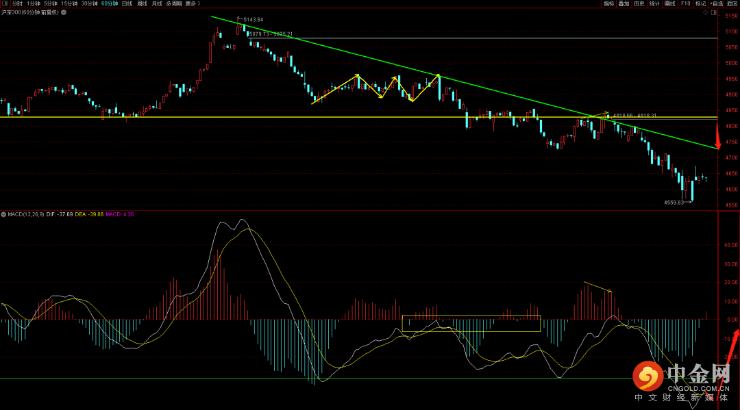 沪深300六十分钟刚出macd红柱,目前这个结构有可能会延续反弹,但从下降趋势线看这个位置的反弹大概率不会有太大的空间,4700点附近就有强压,注意macd在修复之后可能出现的再次回落走势。