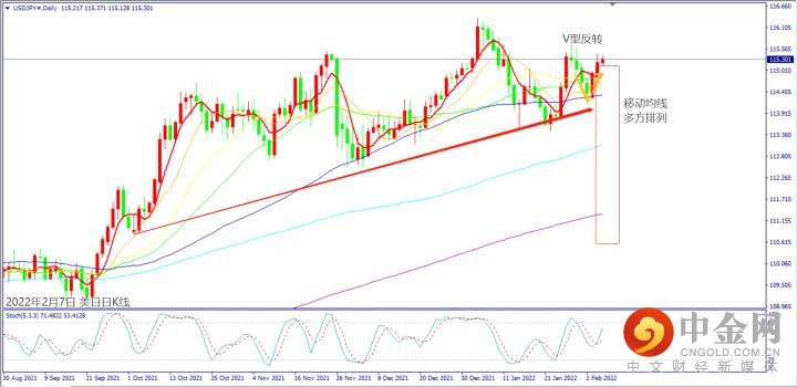 日级别线图,连续上涨出现V型反转,移动均线多方排列,可能延续涨势。