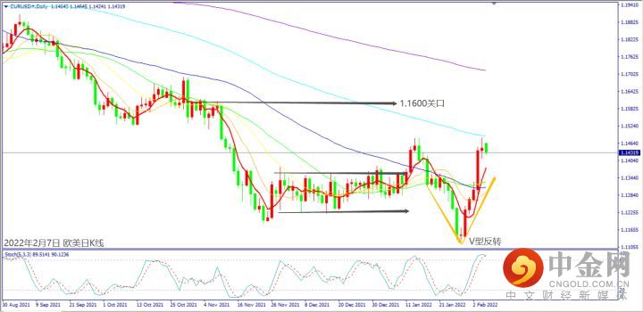 日级别线图,V型反转创三个月来新高,守住5日均线,可能挑战1.1600关口。