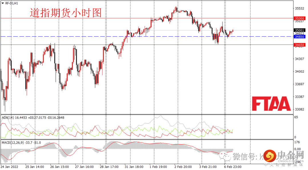 周五美股三大指数涨跌不一,标普和纳指上涨,道指微跌21点或0.06%。美盘盘前的非农数据大超预期,利多市场,美股早盘震荡后午盘上涨。道指日图收出十字星,显示短期多空平衡,日图级别或维持震荡。道指期货方面,周五亚盘小幅反弹,但欧盘和美盘早段下跌,美盘后段反弹。当前ADX指标维持低位,短线或维持震荡。今早亚盘道指期货小幅调整,当前反弹,操作上可逢低在34850附近轻仓多,止损34660,目标35300。