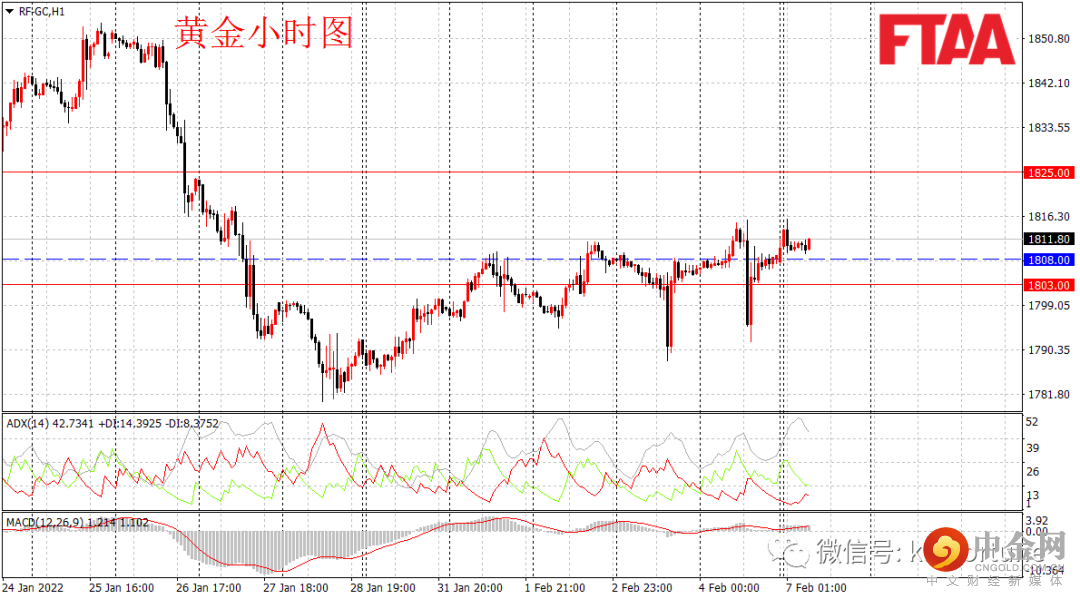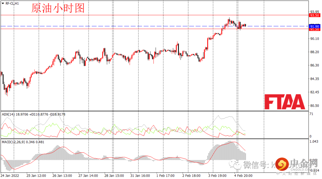 原油周五延续上涨,最低90.05,最高93.14,日图收出上影中阳,显示短期多头继续主导,日图级别维持升势。疫情影响逐渐消退,同时通胀和供需压力继续提振油价。油价在周五亚盘震荡后,欧盘时段持续拉升,美盘后段小幅回落,当前ADX指标高位,MACD红盘运行,油价短线维持震荡偏多。今早亚盘油价治安服震荡,操作上可持有多单,或现价附近轻仓多,止损91.50,目标93.50。