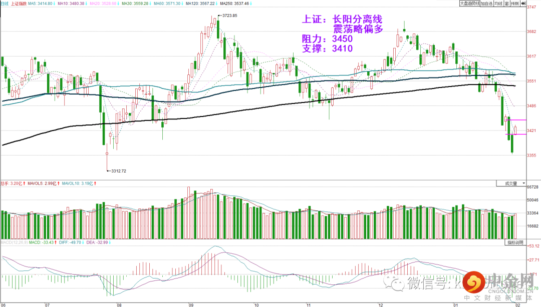 节前最后一个交易日市场下跌,但指数分化,短线有止跌概率。春节期间外盘反弹。A股今日高开震荡。板块呈现分化走势,传统能源、资源、基建等板块上涨,新兴科技题材板块下跌。今日沪指收盘分离线,深成指和创指收高开低走假阴,市场短线或延续震荡反弹。可留意板块轮动机会。