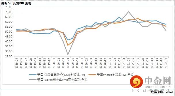 1)美国1月ISM制造业和非制造业PMI均走弱。2月1日,美国发布的1月ISM制造业PMI为57.6,略高于市场预期57.5,但低于去年12月的58.8,创2020年11月以来新低。从分项数据来看,1月新订单指数57.9,环比下降3.1;生产指数57.8,环比下降1.6;价格指数则有所上行,达到76.1,环比上行8.5;就业指数54.5,好于预期值53.0,也略高于前值54.2。同时,2月3日,美国发布的1月ISM非制造业PMI 为59.9,略高于预期值59.5,较去年12月下降2.4,创2021年2月以来新低。分项数据方面,商业活动指数、新订单指数和就业指数分别环比下降8.4、0.4和2.4。