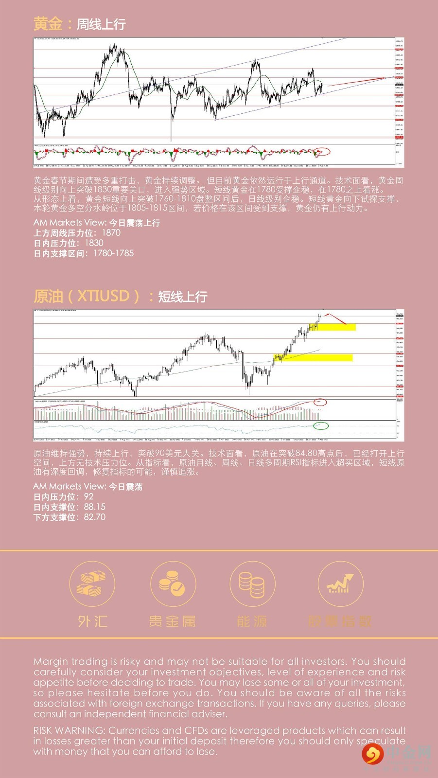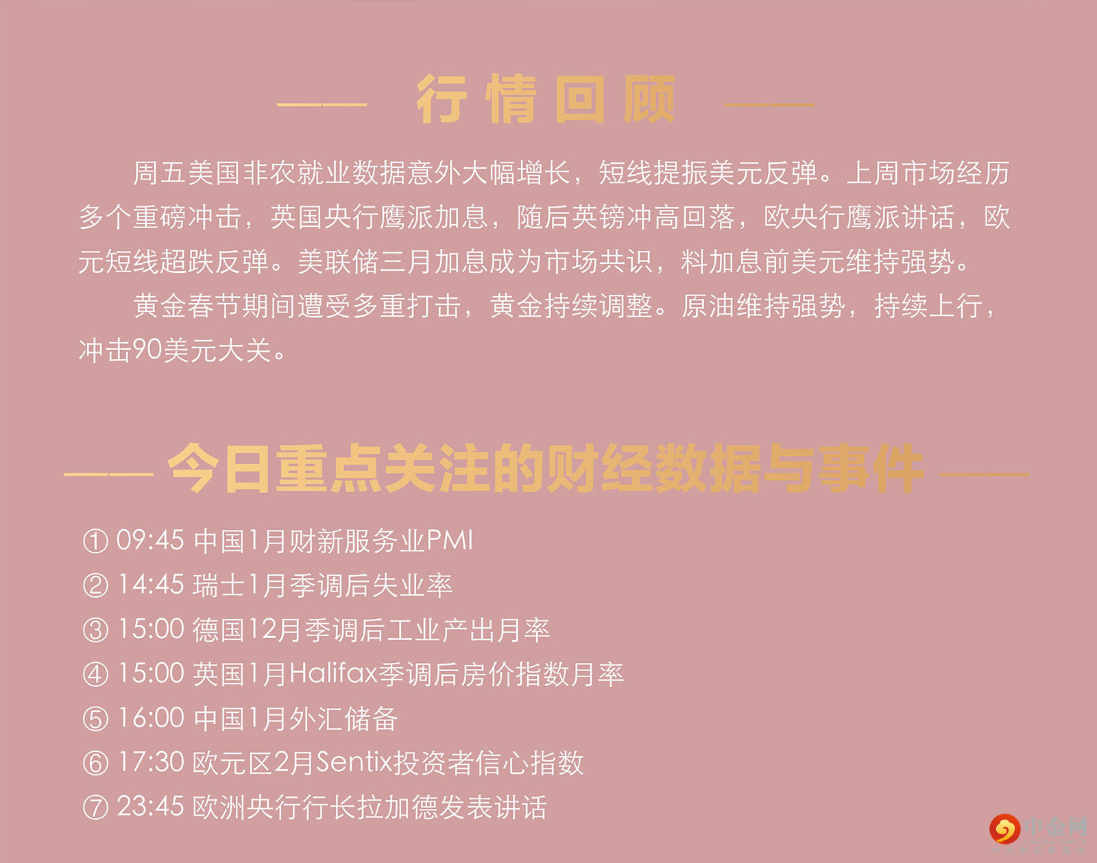周五美国非农就业数据意外大幅增长,短线提振美元反弹。上周市场经历多个重磅冲击,英国央行鹰派加息,随后英镑冲高回落,欧央行鹰派讲话,欧元短线超跌反弹。美联储三月加息成为市场共识,料加息前美元维持强势。 黄金春节期间遭受多重打击,黄金持续调整。原油维持强势,持续上行,冲击90美元大关。