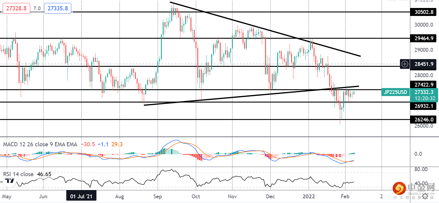日经指数继续守在 27422.9 水平下方,并打破收缩三角形格局。 MACD 和 RSI 均转为正面,暗示上行突破的空间。 如果我们确实在这里突破,28356.6 是下一个值得关注的水平。 不利的一面是,26242 是下一个需要注意的支撑位。