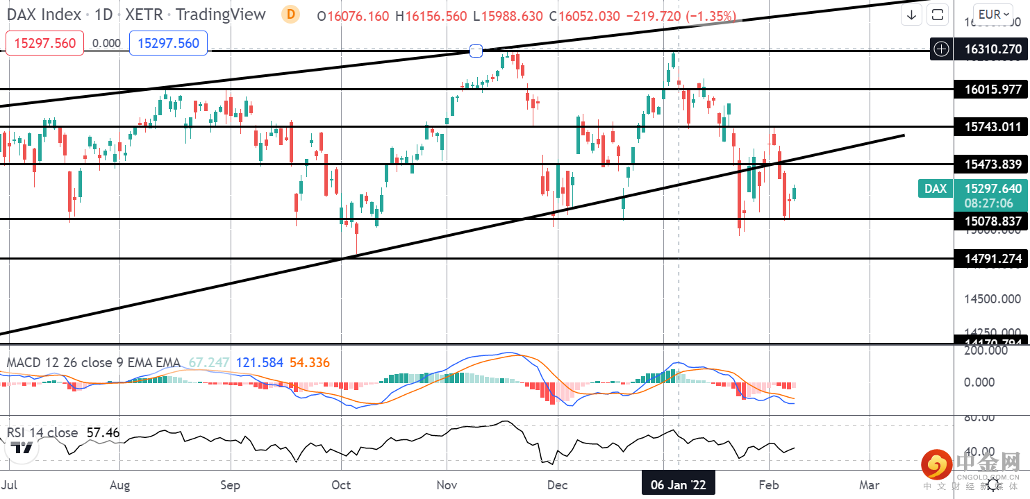 目前,在对支撑区域进行后续测试后,DAX 维持在 15078.83 水平上方。 MACD 和 RSI 均为负值,表明除非价格能够回到破牛趋势线上方,否则有进一步走低的风险。 下行方面,14791.27 是下一个需要注意的支撑位。