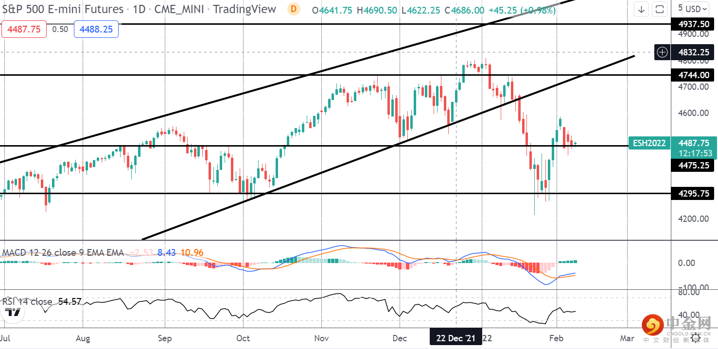 从 4295.75 水平反弹,标准普尔指数回升至目前持有的 4475.25 水平上方。 随着 MACD 转为正,而价格可以保持在该水平之上,重点是推高 4744 水平和破牛通道是下一个值得关注的上行区域
